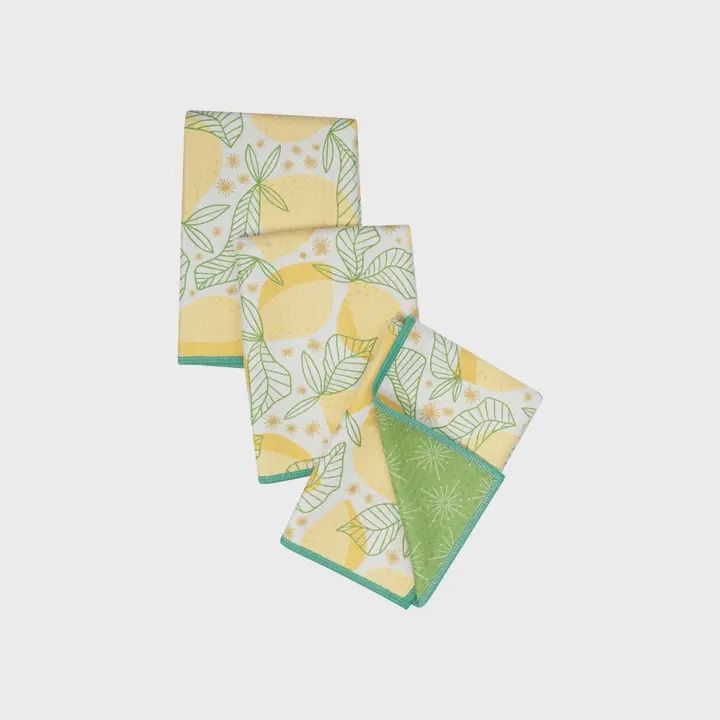 Style: Lemon freshness sashays across this vintage-inspired print. Perfect uses: Paper Towel Replacement, Dishcloth, Washcloth or Casual Napkin. Recycled Impact: 3 bottles were Recycled in making this Set. Dimensions: 13"x13". Reversible: Yes. Includes: Set of Three with Hanging Loops. Material: Made with Certified Recycled Post-consumer Materials. 80% Recycled Polyester, 20% Polyamide. Care: Machine Wash, No Bleach, No Fabric Softener, Tumble Dry.